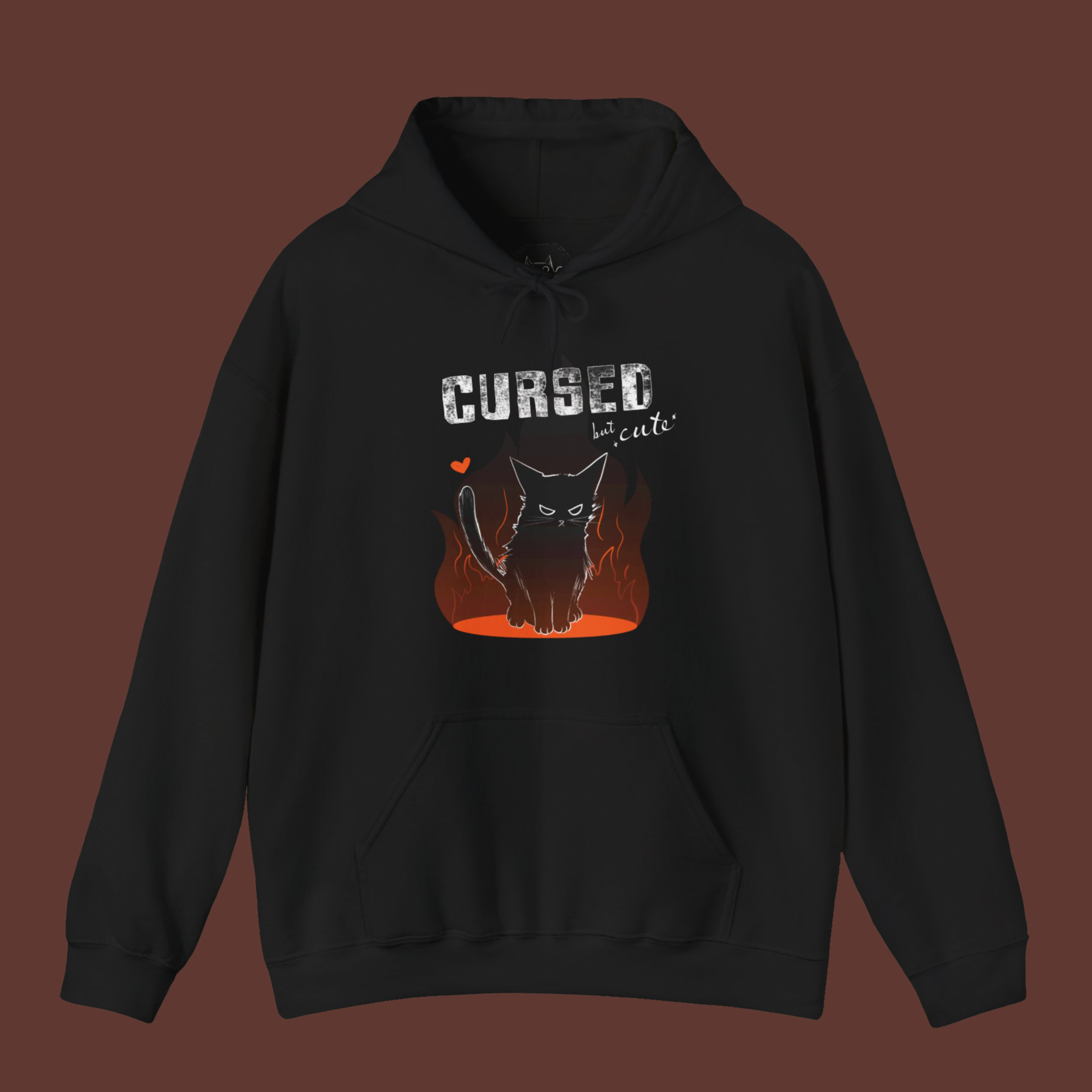 This hoodie is the perfect armor for anyone who looks like they might start a fire with just a glare - and probably already has. Featuring our adorably diabolical kitty surrounded by flames (naturally), the Cursed but Cute hoodie delivers maximum snuggle with just enough “I may hex you” energy to keep people at a safe distance.