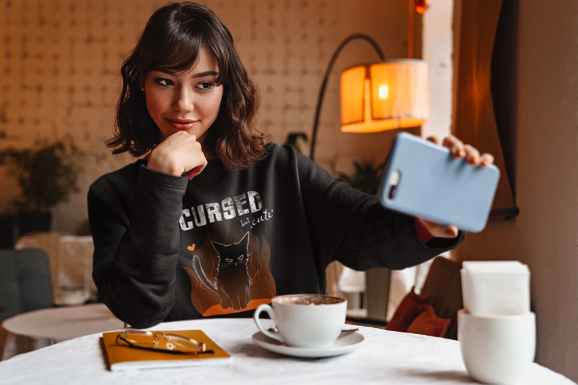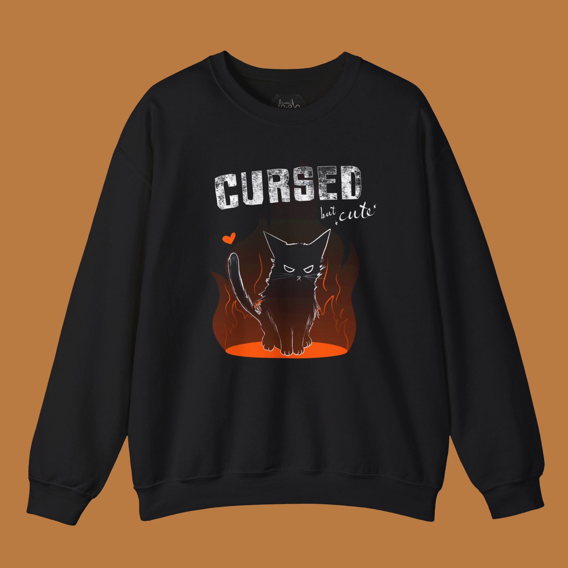 Featuring a “totally innocent” cat casting side-eye from the depths of a firestorm (yes, really), the Cursed but Cute sweatshirt wraps you in cozy while letting the world know that beneath your snuggly exterior lives a chaotic gremlin with a caffeine addiction and no apologies.